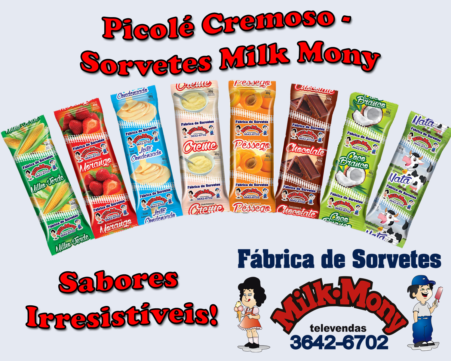 A Fábrica de Sorvetes Milk Mony, traz uma linha de 19 sabores no ramo de Picolés, sendo eles da linha cresmosa (feito com base de Leite) e na linha de Fruta (feito com base de àgua)